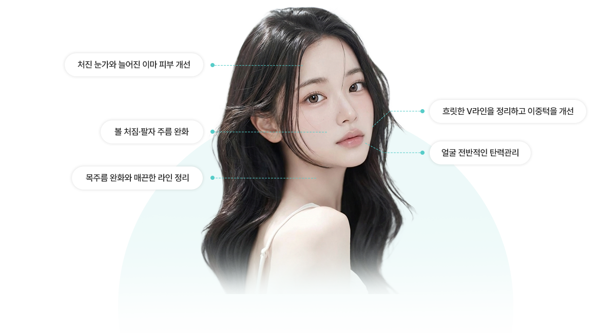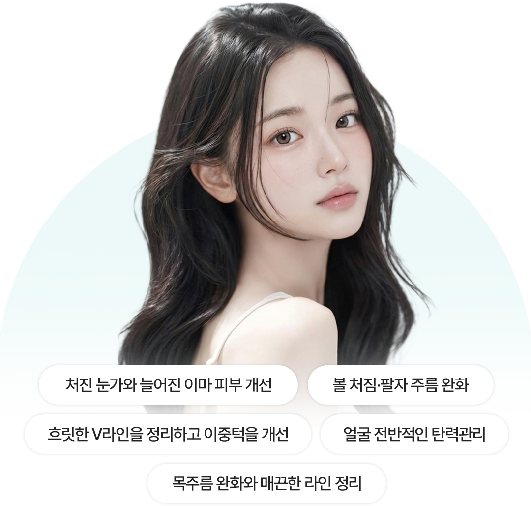 얼굴 탄력 및 주름개선에 효과를 주어 전반적인 페이스라인 정리뿐만 아니라 처진 볼살, 팔자주름, 목주름 개선에도 탁월한 효과를 보입니다.